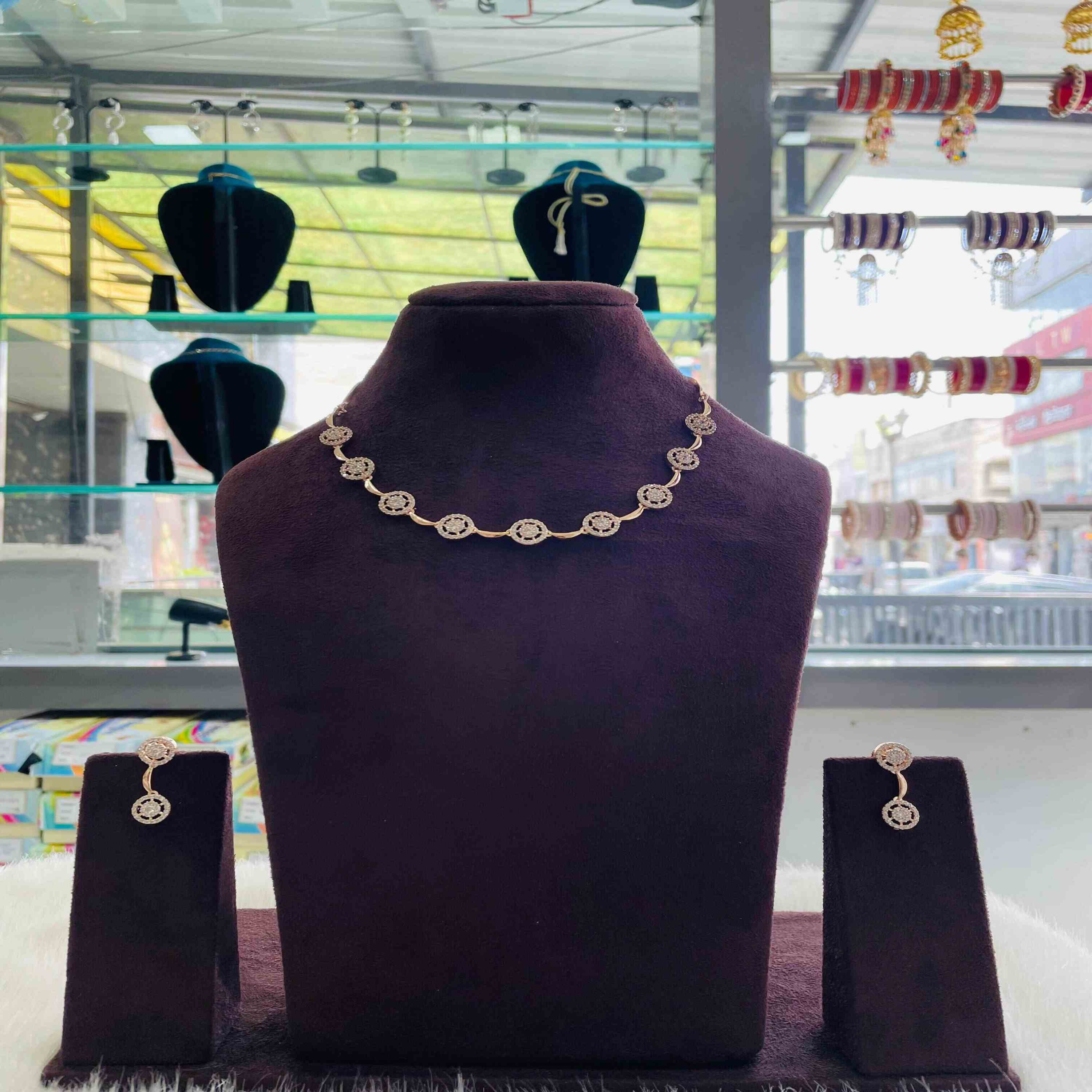 A graceful piece crafted with sparkling American Diamonds set on a rose gold finish base. Lightweight and skin-friendly, this necklace is polished to perfection for a well-finished, long-lasting shine. Its delicate design makes it ideal for weddings, festive occasions, and evening celebrations, pairing beautifully with sarees, lehengas, and Indo-western outfits.