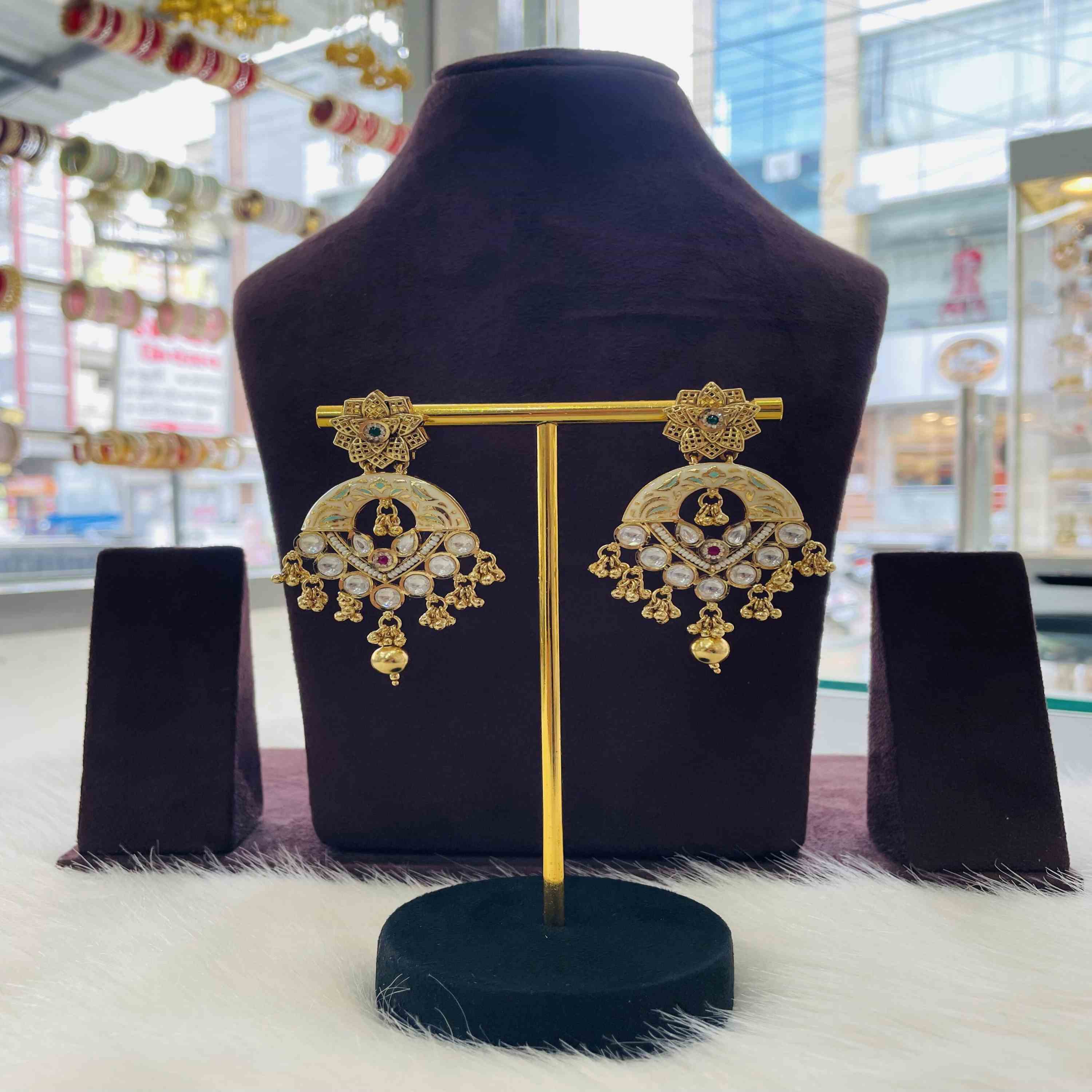 Intricately crafted with traditional meenakari work in antique tones, these earrings bring heritage charm with a premium finish and long-lasting polish. Made from skin-friendly, non-allergic material, they are perfect for weddings, festive occasions, and cultural gatherings.