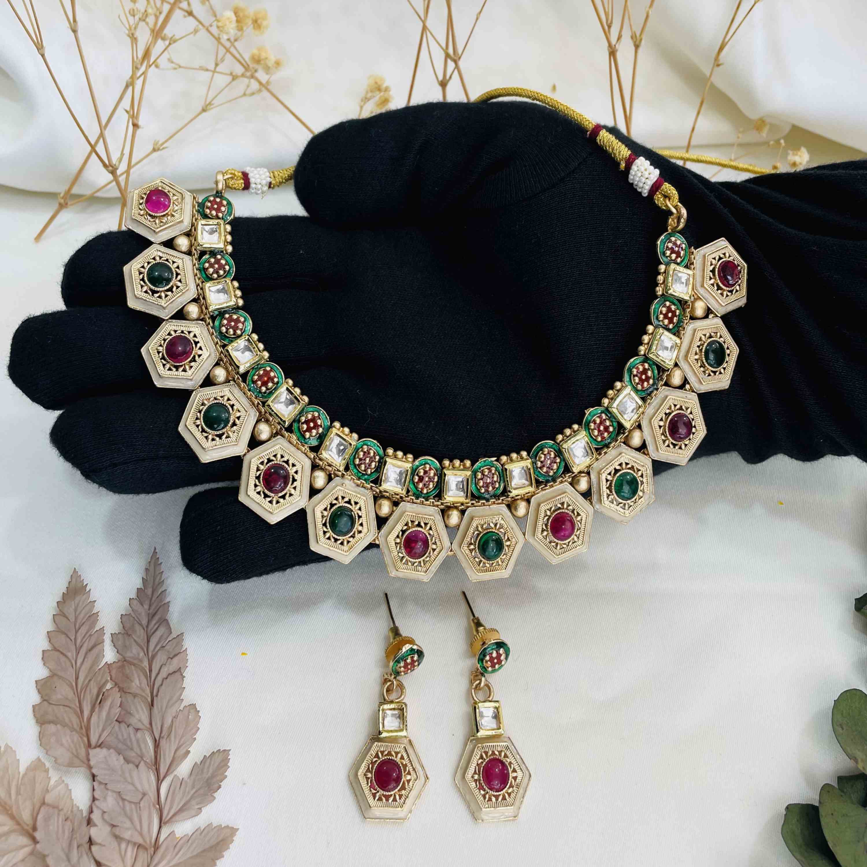 Clean gently: After each wear, wipe the choker and earrings with a soft, dry cloth to remove oils and dust. Avoid using harsh chemicals or abrasive materials.